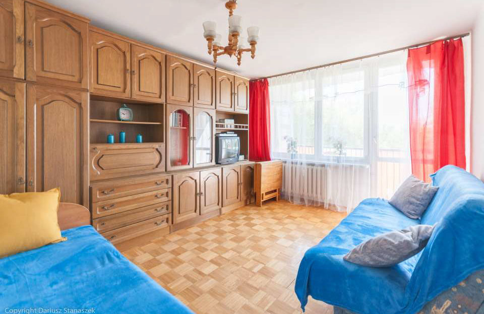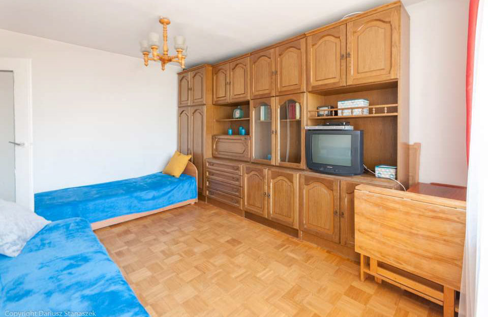 Mieszkanie ma swoje lata ale jest czyste, w pełni umeblowane i wyposażone. Duży pokój jest wyposażony w szafę, komodę i regały, stoliki i krzesła, rozkładane łóżko oraz pojedynczy tapczan, TV i DVD. W małym pokoju jest zestaw meblowy oraz duże łóżko. W kuchni duża lodówka z zamrażarką, kuchenka, okap, sztućce, garnki oraz talerze. W przedpokoju szafa. Na wyposażeniu żelazko, deska do prasowania, odkurzacz.