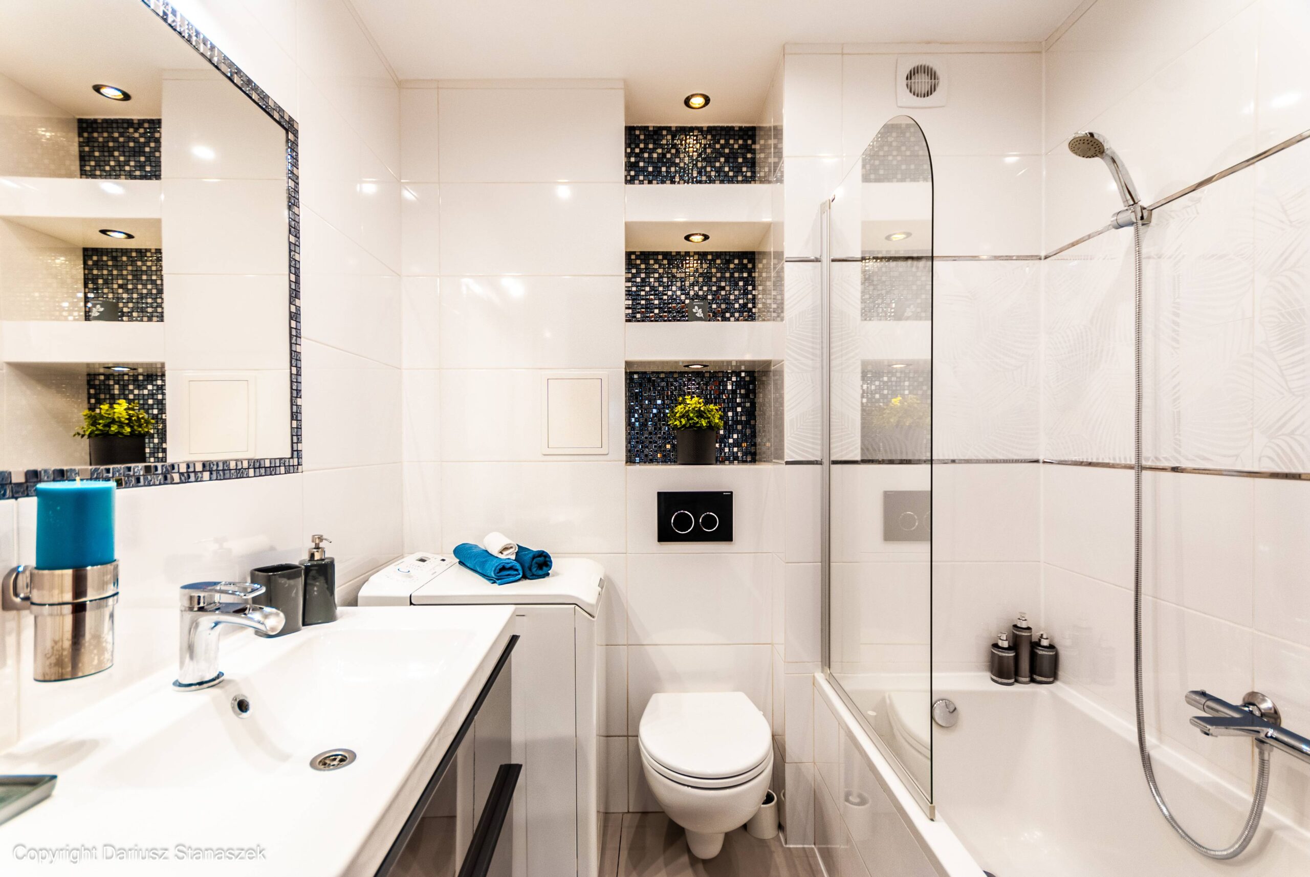 W łazience jest wanna z opcją prysznica, umywalka, WC oraz pralka.