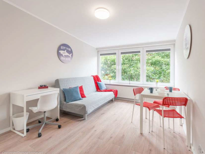 Apartament posiada w pełni wyposażoną, nowoczesną kuchnię ze wszystkimi urządzeniami i stołem jadalnym. W mieszkaniu znajduje się pralka, żelazko, deska do prasowania i odkurzacz.