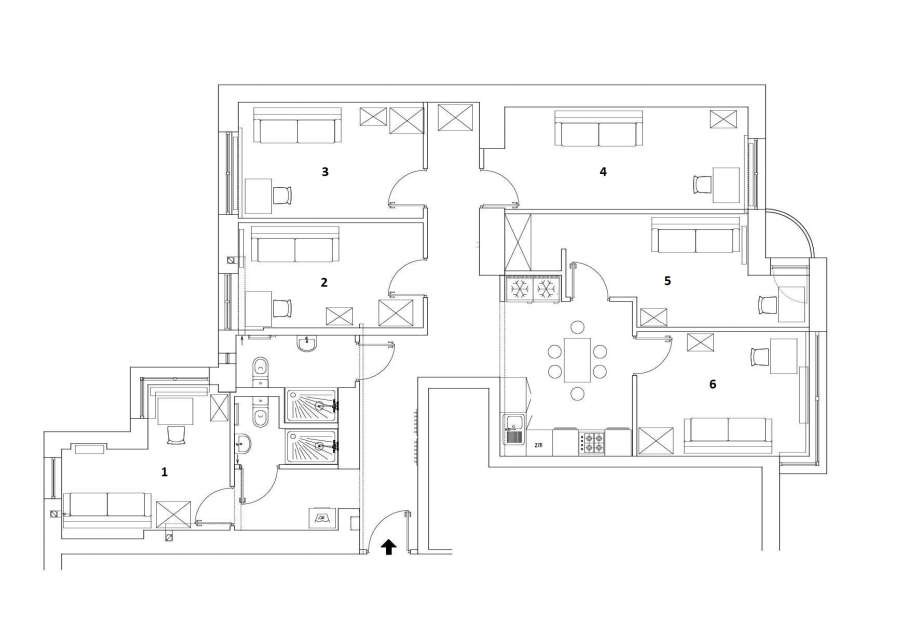 Pokój jest jasny i słoneczny, ma osobne wejście, jest zamykany i wyposażony w rozkładaną sofę, szafę, regał, komodę , biurko, biurko światło, wentylator, krzesło, koc, poduszki, pościel i ręczniki. Pokój ma dostęp do 2 wspólnych (z 5 pokojami) łazienek z toaletą i prysznicem. Mieszkanie jest odnowione, w pełni umeblowane i wyposażone. Składa się z sześciu pokoi jednoosobowych, 2 oddzielnych łazienek z prysznicem i toaletą oraz dużej kuchni z jadalnią.